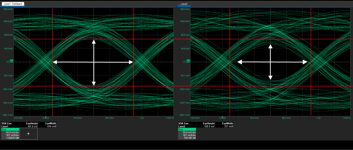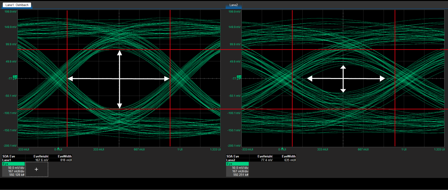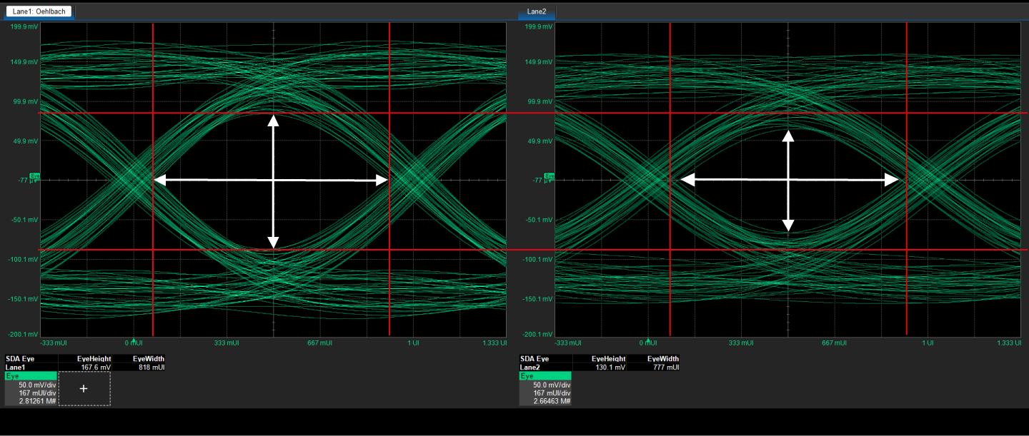 Das Augendiagramm zeigt die allgemeine Qualität des Kabels bzw. des Signals welches am Ende bei der Messung rauskommt. Das Signal bzw. Kabel ist um so besser, umso weiter das Auge in der Mitte geöffnet ist.